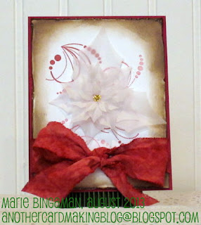 For the flower, of course I had to use my Spellbinders poinsettia die again, cut out of vellum. I distressed the edges of the white panel with scissors and Frayed Burlap DI. Dyed the seam binding with the dark red ink used to stamp the swirls, and added some Fired Brick to add dimension to the color a bit. I was hoping the poinsettia would stand out a bit more, but I didn't want to distress it at all...it looks better IRL, I promise!