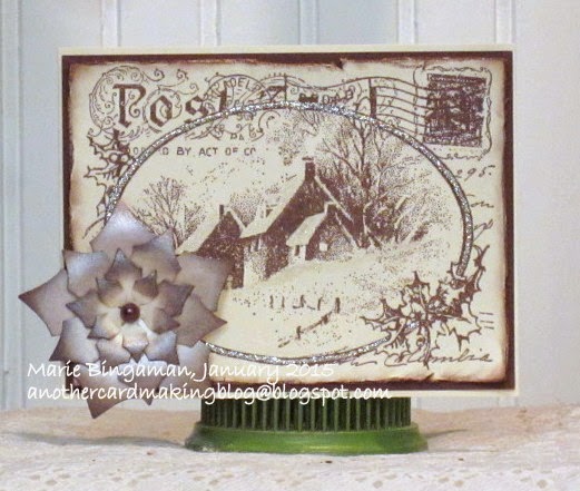 I decided to go with a nice monochromatic color scheme, using the snowy postcard stamp I have been dreaming of owning for a good while now! I just couldn't pay the regular price for it...that day- after-Christmas sale at Michael's came to my rescue this time, when the Christmas stamps were 75% off. In my cart it went! SO HAPPY!!