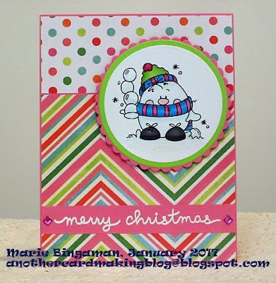 These little guys come offered together as one set, BUGSTB01 Snowman trio blocks, and they are so, so cute! I used my Cameo to size and cut them with a white border, and also to make the colored mats for each image. They were colored up with a combination of alcohol markers to match the adorable mitten patterned paper by Recollections. I added some iridescent sequins, and the snow on all three images was covered with Spectrum Noir Clear Sparkle pen (I swear!).