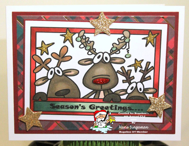 Today's Freebie Friday image is Reindeer Trio. I really like this color scheme for Christmas! It's very traditional, and reminds me of Christmases past. The patterned paper comes from Recollections 12x12 Fireside paper pad. I used the smallest star from Spellbinders' set to cut 3 stars from a brass colored glitter cardstock scrap to accent the card. Image is colored with alcohol markers, and Stickles was added to the center reindeer's nose (I would assume Rudolph would take center stage!), to the ornaments in his antlers, and the stars on the image.